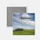 Souvenir fridge magnet with the text: 'Toscana' and a group of cypress trees in a landscape with green hills and yellow flowers under beautiful white clouds near Torrenieri in the Val d'Orcia (Orcia valley) in Tuscany, Italy.