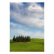 Vertical photo print of a group of cypress trees in a landscape with green hills and yellow flowers under beautiful white clouds near Torrenieri in the Val d'Orcia (Orcia valley) in Tuscany, Italy.