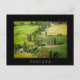Postcard of a zigzag winding, cypress tree lined road through the green fields in Monticchiello, Tuscany in Italy with a black border and the text: 'Toscana', Tuscany in Italian.