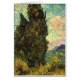 Cypresses by Vincent van Gogh is a vintage fine art post impressionism landscape nature painting. Cypress trees in a meadow, white fluffy clouds in the blue summer sky and a sliver of a crescent moon.