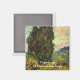 Cypresses by Vincent van Gogh is a vintage fine art post impressionism landscape nature painting. Cypress trees in a meadow, white fluffy clouds in the blue summer sky and a sliver of a crescent moon.