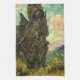 Cypresses by Vincent van Gogh is a vintage fine art post impressionism landscape nature painting. Cypress trees in a meadow, white fluffy clouds in the blue summer sky and a sliver of a crescent moon.