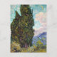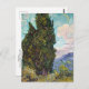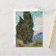 A fine art postcard with the painting, Cypresses (1890) by the Dutch artist Vincent van Gogh (1853-1890). A post-impressionist landscape with a large cypress tree in the foreground and a swirled colourful sky with a crescent moon.