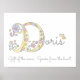 Pretty D initial / monogram art name poster perfect for a girls bedroom or playroom in shades of grey, white, yellow, pink and purple. Personalise with your child's own name beginning with D, and name meaning for a truly personalised touch to your child's bedroom or nursery, this example is for the name D Doris Gift from the ocean. Speak from the heart. Cute poster print ideal for a new baby, christening or baby shower gift. © Unique initial letter D hearts and flowers drawing description and graphic art design by Sarah Trett. www.sarahtrett.com for www.mylittleeden.com