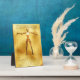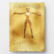 Gold looking stand up plaque art, with graphics of a golden robot in place of Da Vinci's Vitruvian Man. Fun futuristic take on a masterpiece.