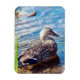 A photograph of a female Mallard duck standing in the shallow area of a pond, with water ripples moving away from her in a circular motion.