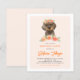 Invite guests to your event with this customisable birthday invitation. It features watercolor illustrations of a cute dachshund, and peach flowers. Personalise by adding your details. This cute dachshund invitation is perfect for birthdays, baby showers, and other events.