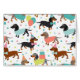 Cute birthday party dachshund dogs with black, tan and dapple coats dressed in cute birthday outfits with balloons, cake and confetti pattern.
