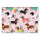 Cute birthday party dachshund dogs with black, tan and dapple coats dressed in cute birthday outfits with balloons, cake and confetti pattern.