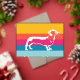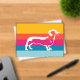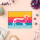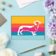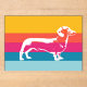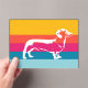 A dachshund is shown with simple colors behind it. The background has bright stripes in different colors. The dog stands still and looks forward.
