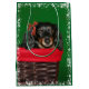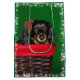 Long haired black and tan dachshund in a Christmas basket and a red Christmas bow in her hair cute dog lovers Christmas holiday gift bag