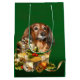 Long haired and slightly elderly red dachshund proudly sits by her Christmas gifts dog lovers Christmas holiday gift bag