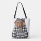 Cute dachshund dog in a black and white plaid bag with the funny text "I go where you go"