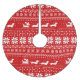 Red and white Christmas sweater style pattern with Dachshunds wearing holiday sweaters and a squirrel riding a sleigh pulled by doxies. Text: Love Joy Peace Wiener Dogs. A fun and festive Christmas tree skirt for Weenie Dog lovers.