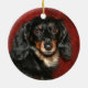 Long haired black dachshund face with a red Christmassy background photo Christmas or any other time ornament