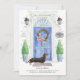 Announce your new address with our stylish announcement featuring a Dachshund, blue front door, welcome mat, slate sign, topiaries and a floral wreath set on a grey brick background.