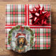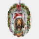 A Christmas Holiday Ornament Card with Dachshund sausage dog in a Santa hat and holiday lights, stood in front of a Christmas decorated front door. brown and tan wiener dog Holiday decoration cards, a unique wonderful alternative to a traditional card from Ricaso - add your own text
