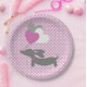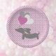 Celebrate in long-dog style with these playful dachshund paper plates! The design features a sweet grey sausage dog prancing proudly while holding a bundle of heart-shaped balloons in shades of pink, grey, and white. Set against a pastel pink polka-dot background, these plates bring instant charm and whimsy to your party table.