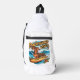 A cute dachshund dog riding a surfboard on a huge wave Beach Adventure near a tropical island, embodying carefree beach vibes with the words dachshund vibes.