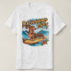 A cute dachshund dog riding a surfboard on a huge wave Beach Adventure near a tropical island, embodying carefree beach vibes with the words dachshund vibes.