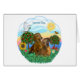 It's a happy day in the country with a smiling sun, pretty flowers, a dove flying overhead and two red or brown Dachshunds sitting in the soft emerald green grass as the soft breezes blow.
