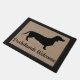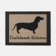 Dachshunds welcome doormat with a faux burlap printed background, black edges, and a black dachshund weenie dog silhouette.
