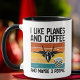 This funny aviation mug is for anyone who runs on jet fuel and caffeine and keeps their social circle small on purpose. Featuring the phrase “I like planes and coffee and maybe 3 people”, along with a jet fighter airplane, a checkered coffee cup, and a retro sunset background, it delivers dry humor that aviation lovers instantly relate to.