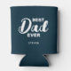Dad Navy Blue White Typography Fathers Day Custom Can Cooler is perfect to keep dad's beverage cold. It has a minimalist modern design on dark blue background and large bold white letters with quote "best dad ever." Name or customised text is across lower centre. Design is on both sides. Font is trendy script lettering mixed with simple letters.