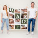 Customise this unique blanket with 8 square photos arranged in a grid collage layout. Featuring "Dad" going diagonal on green army camo squares and additional square on the bottom for a custom message. Keep "we love you" as is or change to your custom endearment.