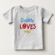 Daddy Loves Me T-shirts, long sleeve tees, sweatshirts,pullover hoodies, hats, ruffle shirts, sleeveless dresses, ruffle dresses, raglan T-shirts, football bodysuits, organic bodysuits, and other apparel for baby with text of red, blue, and gold with a heart that reads Daddy Loves Me!