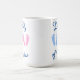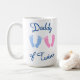 Cute coffee mug with "Daddy of Twins" in blue and cute baby boy and girl footprints in blue and pink.