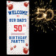 Dad's 50th Birthday Party Hanging Banner created for a Father's special age birthday celebration! Designed in bold blue and red with balloons, confetti and text: Welcome to, OUR DAD'S, and 50th Birthday Party. To personalise, simply replace the sample text using our easy step-by-step template. Note - The age number can be changed as you like!