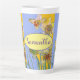 Hand Painted Pink Purple Yellow Daffodil floral Latte Mug, with a fully customisable name. A glorious watercolor floral design. Designed from my original watercolor paintings, that I painted from my own flower garden.