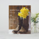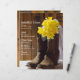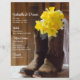 Personalise the casual yet classy Yellow Daffodils and Cowboy Boots Country Barn Wedding Menu with the details of the meal that you will serve at your March, April or May spring western ranch theme bridal shower luncheon, marriage reception or wedding rehearsal dinner. Personalise it with the names of the bride and groom, venue location and date or text and font of your choice. This charming custom menu features a quaint floral photograph of yellow narcissus flower blossoms, brown leather cowboy boots, white bridal veil and weathered barn wood.