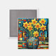 A.I. created interpretation of a vibrant bouquet of yellow daffodils stands out against a backdrop of surreal geometric shapes and bold colors. The intricately patterned vase houses the flowers.