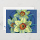 Enjoy spring anytime with this floral daffodils fine art postcard. Postcard created from original painting ‘Daffodils – the joys of spring’ by Sarah Trett. Reproduced from original watercolour and gouache painting on blue card by Sarah Trett.