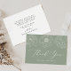 Elegant floral thank you card featuring a top border of dainty white flowers with a sage green background. "Thank You" is displayed in a white modern script with your name shown below. The back of the card features your message in black lettering. The floral thank you card is perfect to use for weddings, bridal showers, baby showers, birthdays, and more!