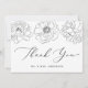 Elegant floral thank you card featuring a top border of dainty black flowers with a white background. "Thank You" is displayed in a white modern script with your name shown below. The back of the card features your message in black lettering. The floral thank you card is perfect to use for weddings, bridal showers, baby showers, birthdays, and more!