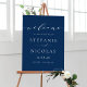 Welcome your wedding guests with this romantic wedding welcome sign. This customizable wedding welcome sign features a dainty script with classic typography on a navy blue background.