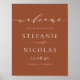 Welcome your wedding guests with this romantic wedding welcome sign. This customisable wedding welcome sign features a dainty script with classic typography on a terracotta background.