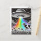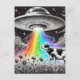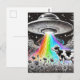 A dairy cow looks up at a UFO that is beaming down rainbow rays in a wildflower meadow AI generated art