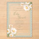 Celebrate the upcoming arrival of your little bundle of joy with an invitation with soft white daisies embellishing each corner of this lovely baby shower invitation. Perfectly framed with a white scalloped edge. Coordinating fonts add to the beauty of this design.