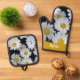 Daisies Floral Pattern Custom Name Oven Mitt & Pot Holder Set. White daisies pattern on a black background.