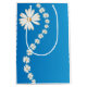 Gift bag shown in a solid colour of white with a cute blue daisies print.