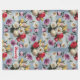 It's a fleece blanket with an illustration of a variety of flowers. There are roses, daisies, lilies, and tulips in different colours like red, white, yellow, and pink. The flowers are arranged in a circular pattern, with the largest flowers at the centre and the smaller flowers gradually getting smaller as they move outward. The background is a light blue sky with fluffy white clouds.