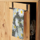 Modern decorative kitchen towel with sunny daisies on dark grey background.