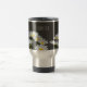 Modern decorative personalised travel mug with sunny daisies on dark grey background.