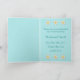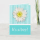 A combination of solids and stripes gives this baby boy birth announcement card loads of style. The lower third of the card is a solid blue-green. The top portion is wavy, vertical stripes in varying shades of blue-green with a big, white daisy in the centre. A white band separates the two parts. Inside the card are rows of smaller daisies along the top and bottom edges. The fully customisable text inside can easily be changed to suit your own needs. From my original digitally created design.