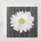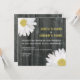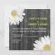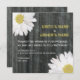 A wedding invitation featuring a background photo of weathered barn wood. Antique inspired photos of daisies at top left and bottom right corners. Personalise the matching text with details of your event. Back side single daisy at centre over barn wood background.