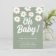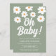 This floral baby shower invitation is decorated with hand-drawn daisies and stylish white retro typography on a green background.